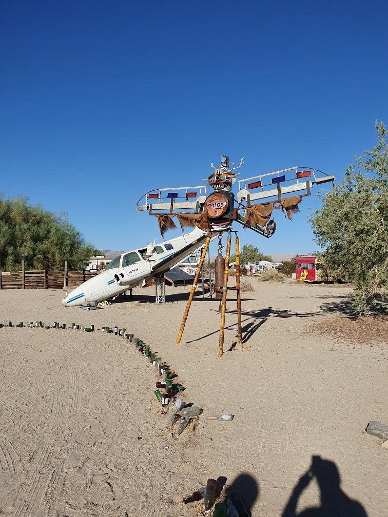 We made some friends at Fountain of Youth Spa (FOY as the locals call it). K&E from Washington were parked right beside us. Very friendly and on day 2 took us into Bombay Beach for lunch at a local pub. Now remember, Bombay Beach was hopping in the 50s and 60s, but is really a very depressed little village now. We weren’t sure what to think, but we really wanted to see the Salton Sea and the surrounding area. The State is really trying to clean up the Sea and they are using hay bales to create compost to allow for fertile soil. Not sure how this is going to work, but we’ll see. We were shocked at the state of the little town/village. In fact some places looked uninhabitable. There were interesting art works everywhere, in peoples’ yards and on the beach. The most surprising though, was the pub we went to eat at. Outside looked VERY tired and worn down, then you open the door and “WOW” – nothing like what we were expecting. The food was also VERY good, a welcome surprise.