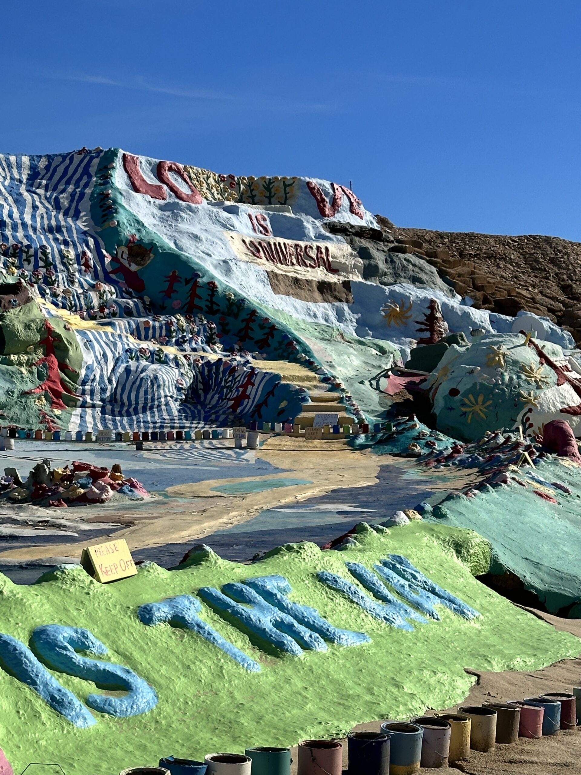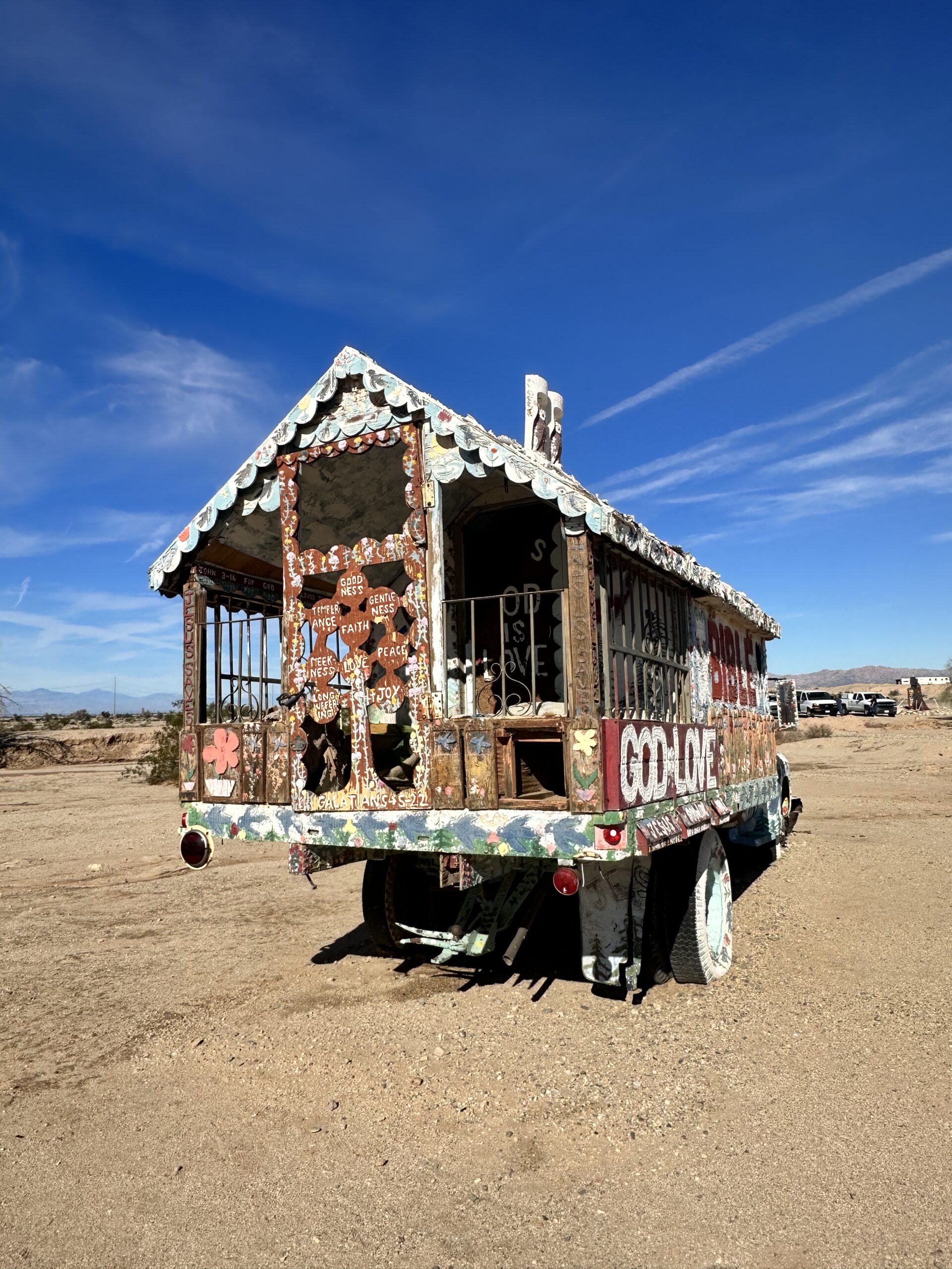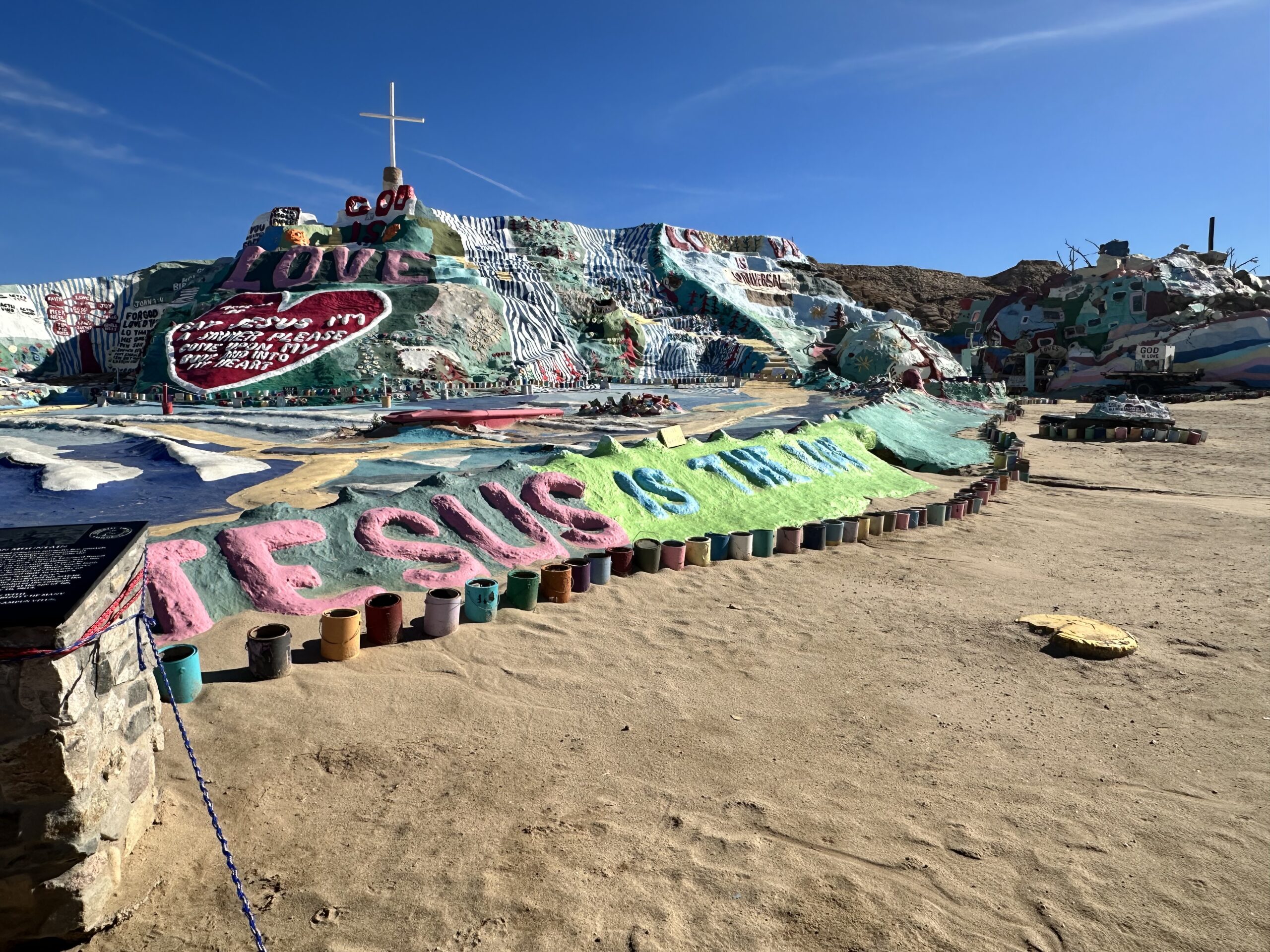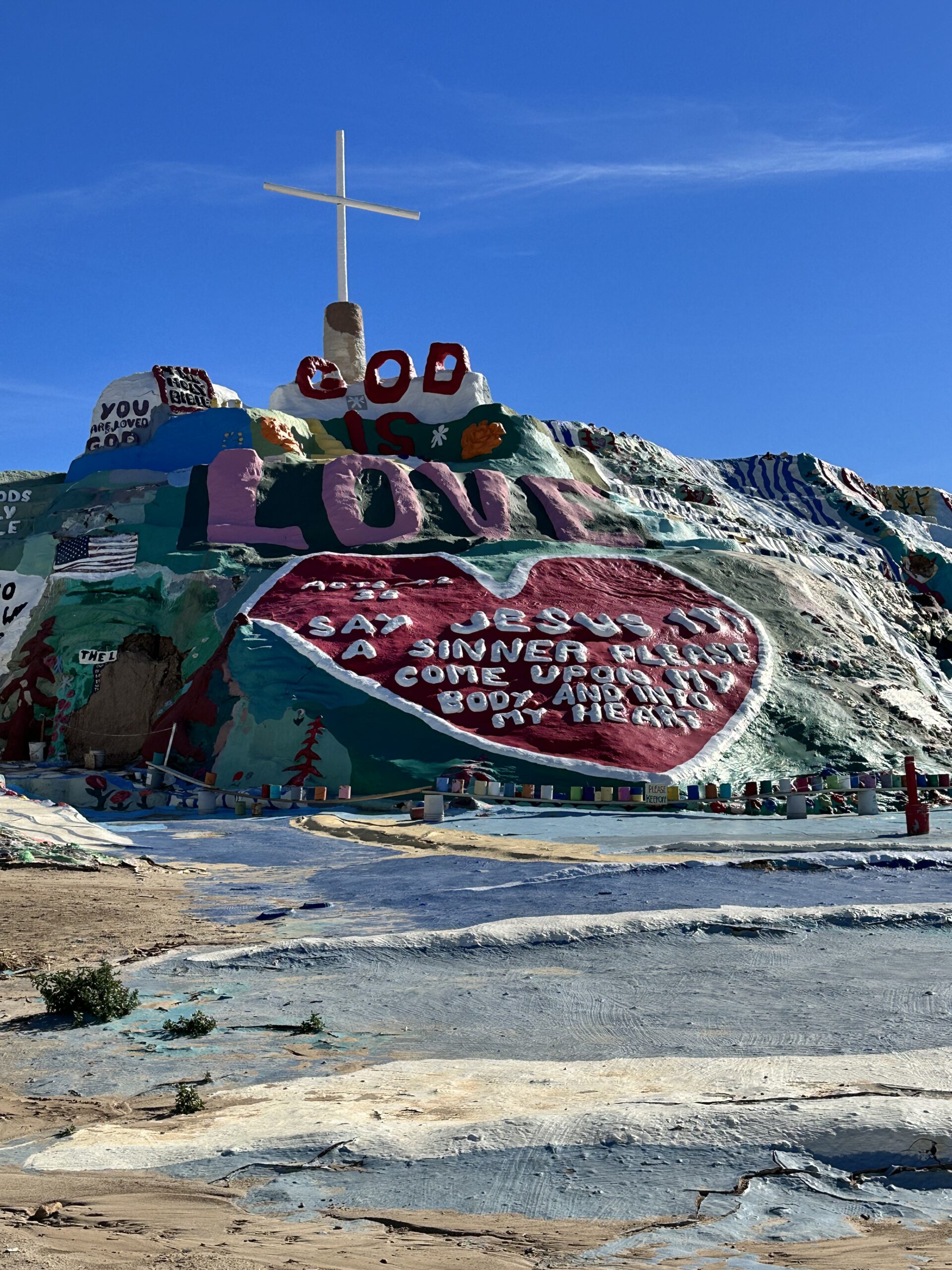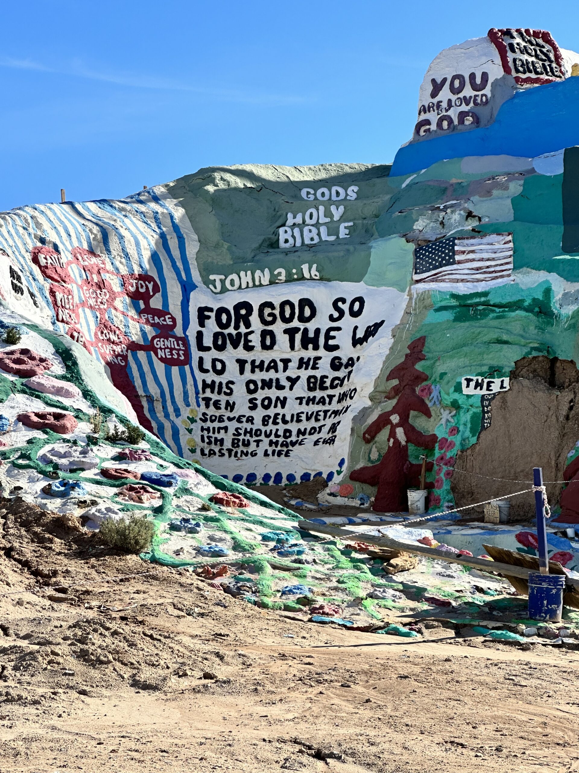 After finding faith in the 1970’s he began the creation of a hot air balloon to share Jesus’s messages.  While the balloon never took flight, he evolved his plan and decided to share God’s love via the 28-year creation of Salvation Mountain in the Sonoran Desert.  He did so by building, and rebuilding after storms, this incredible mountain from hay bails and other finds and then set about painting it.  Much of the paint he found in the trash and over time as word got out people began visiting and donating leftover paint.