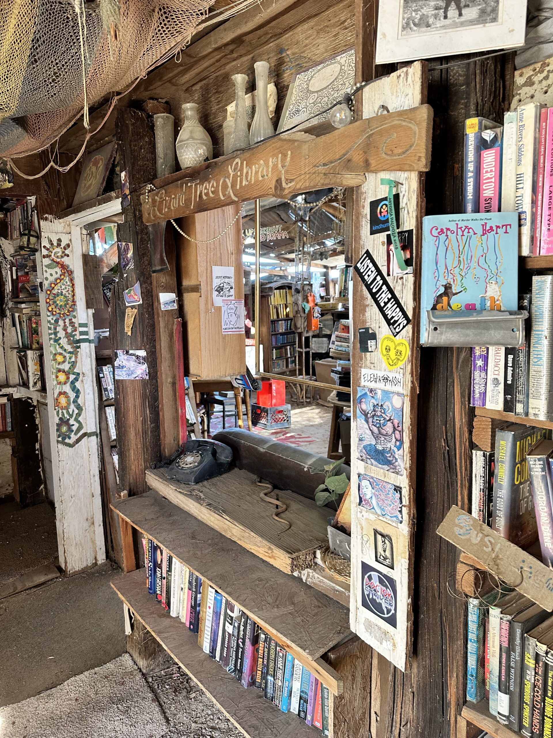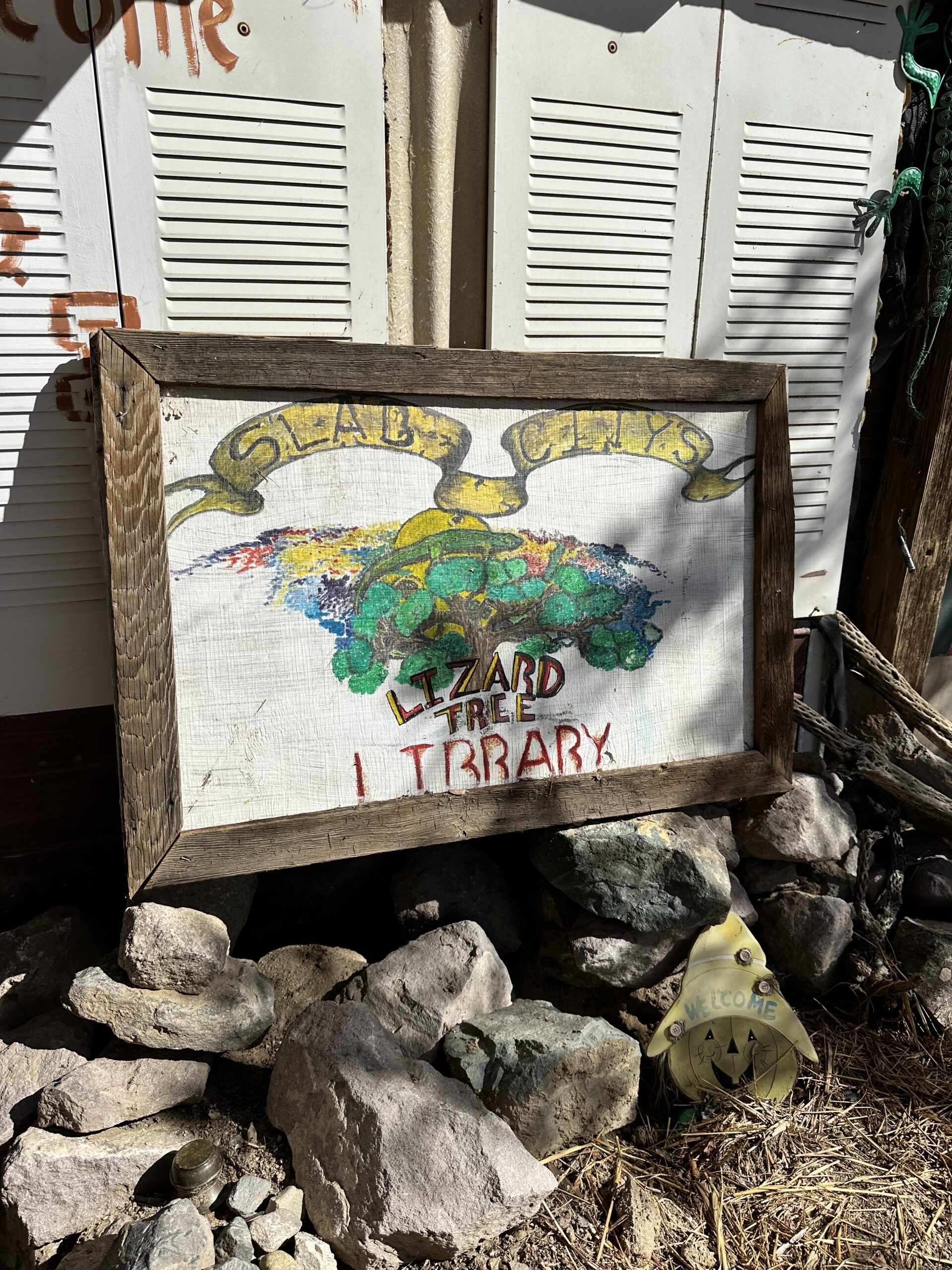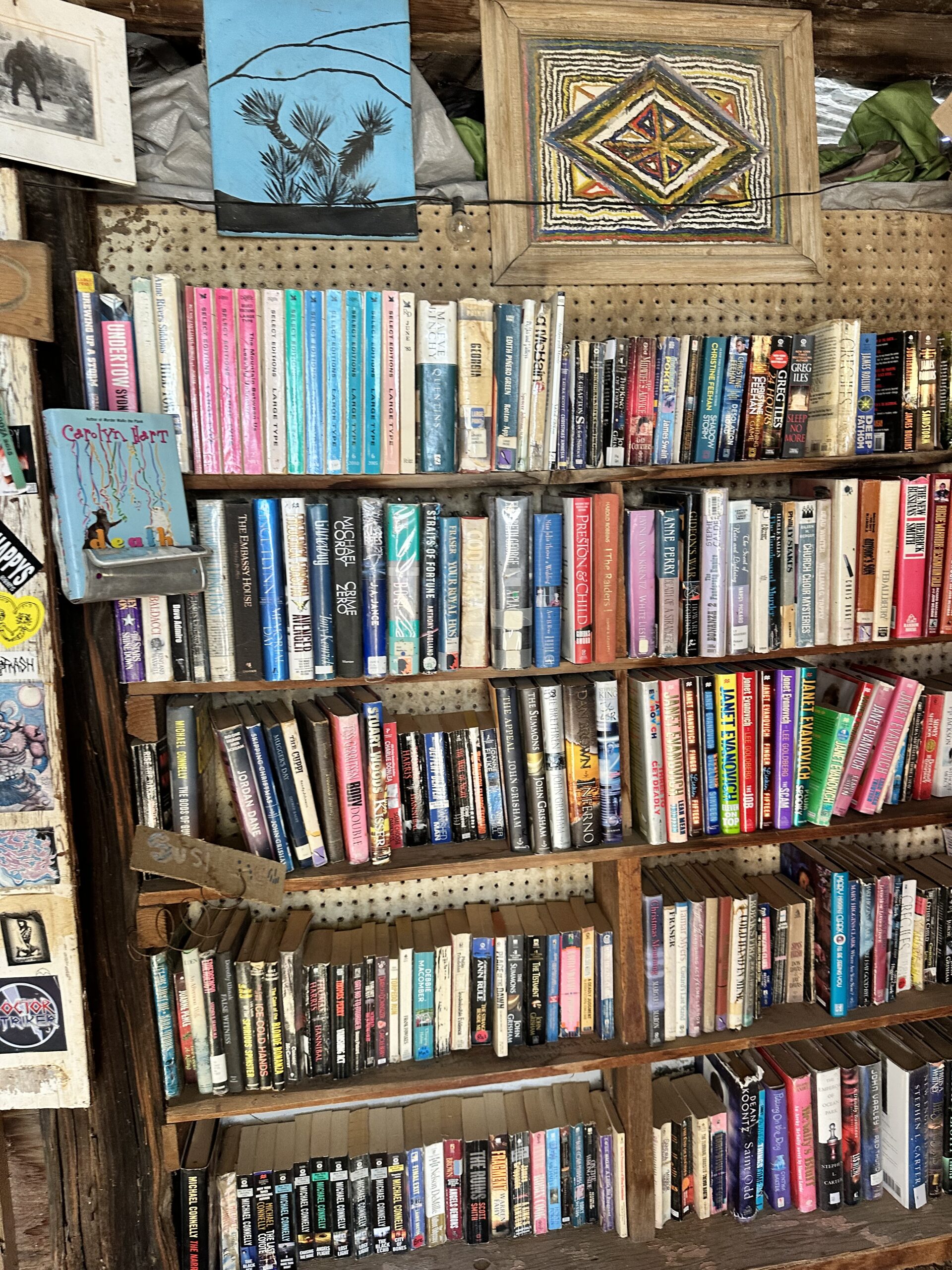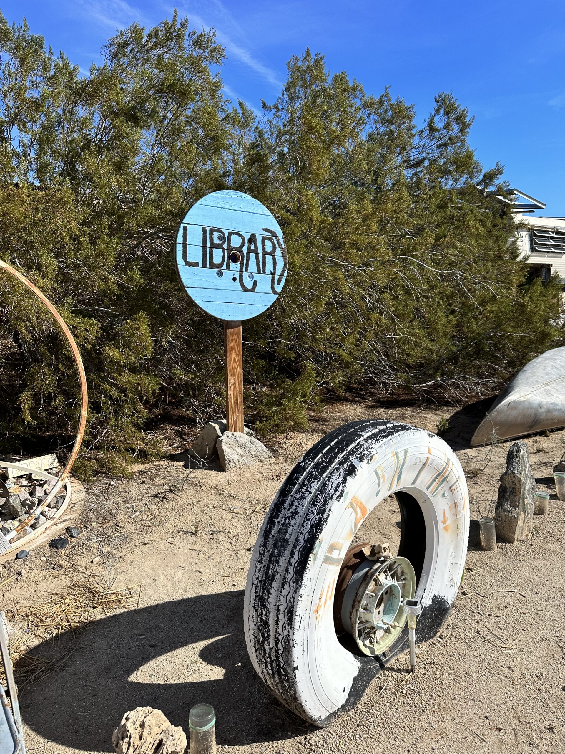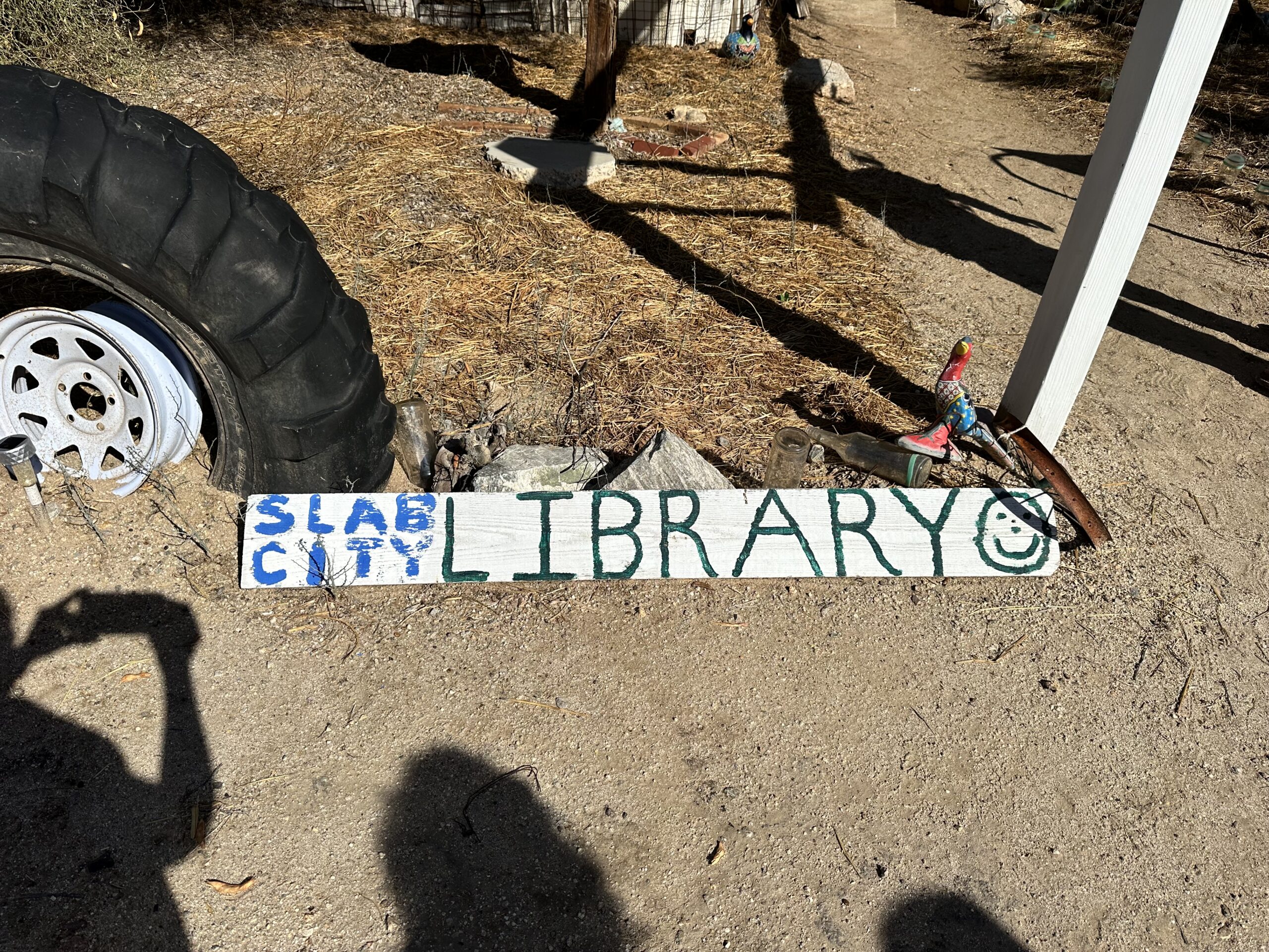 Children in Slab City primarily receive their education through nearby public school districts, with school buses from adjacent communities picking up the few children living there.  Some residents also opt for homeschooling or independent study methods given their ‘off the grid’ chosen lifestyle.   One of the most fascinating buildings in the city was their library. We were shocked at how many books were there. Older ones and some very current ones. Mainly, all received through donations from residents and the majority from visitors. We met their self-appointed librarian who wanted to bring organization to the library and has worked tirelessly to achieve that. He toured us around and we were blown away at the cataloging and ease of finding the thousands of resources. Clearly if one had the interest and capability of educating their children this was the place to do it.